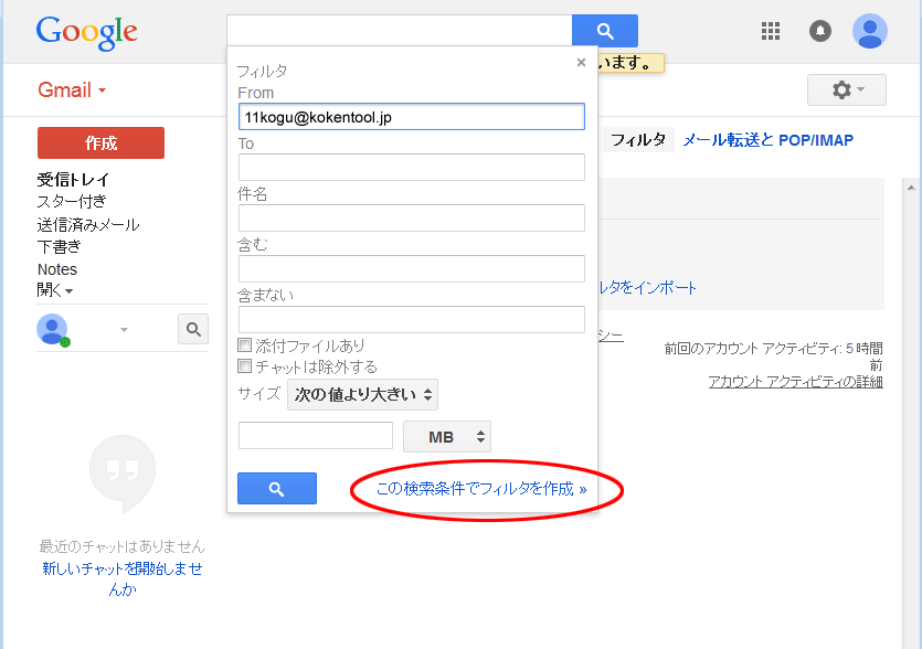⑤フィルタ条件を入力し、【この検索条件でフィルタを作成】ボタンをクリックします。