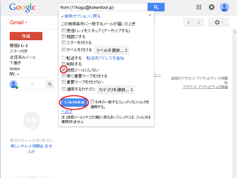 ⑥[迷惑メールにしない]にチェックを入れ、【フィルタを作成】をクリックします。
