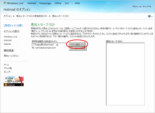 ⑤受信を許可するメールアドレスを入力し、【リストに追加】をクリックします。