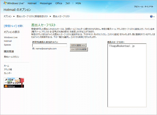 - 許可する差出人またはドメイン : 11kogu@kokentool.jp